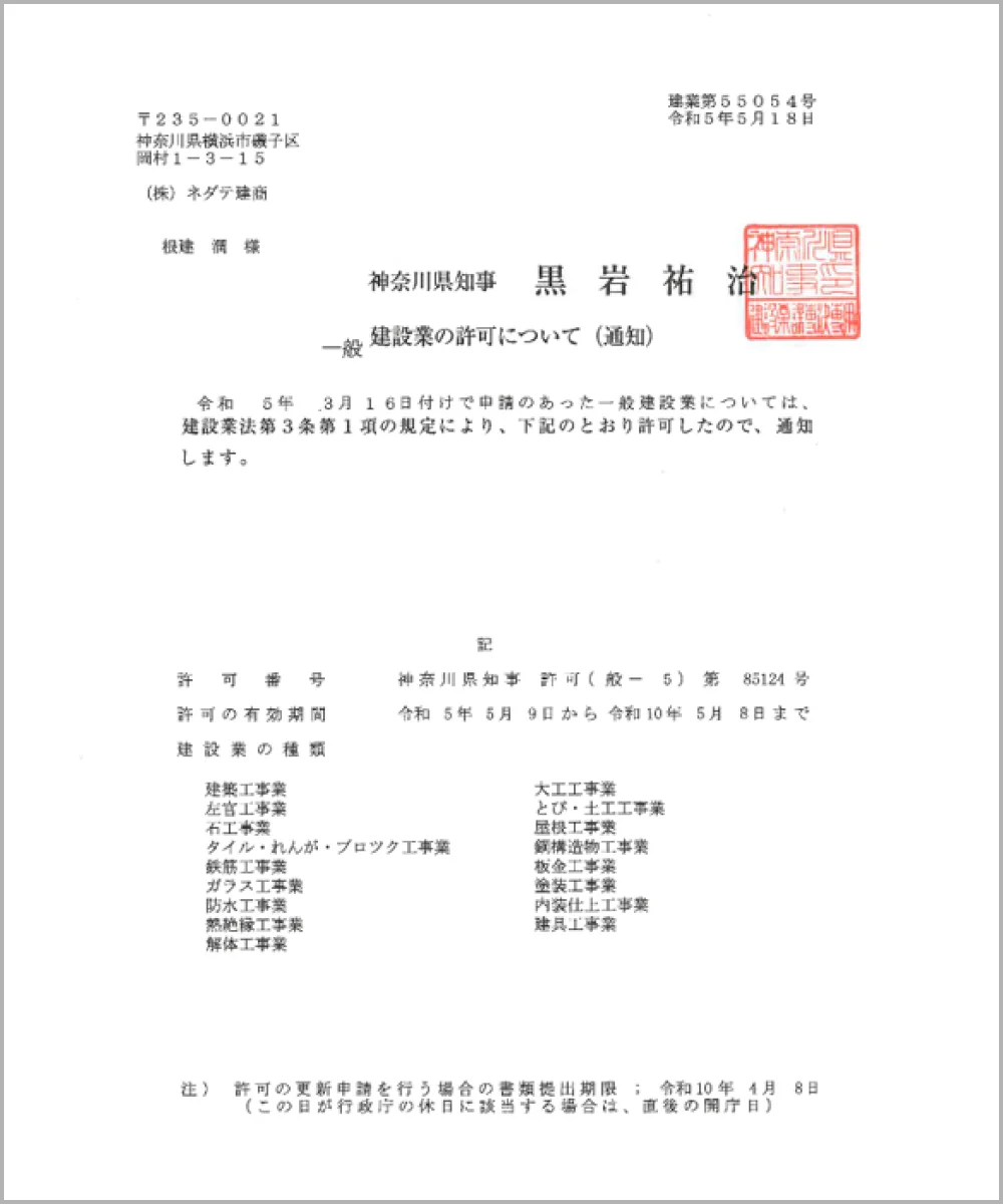 一般建設業の許可 神奈川県知事 許可(般-30)第85124号